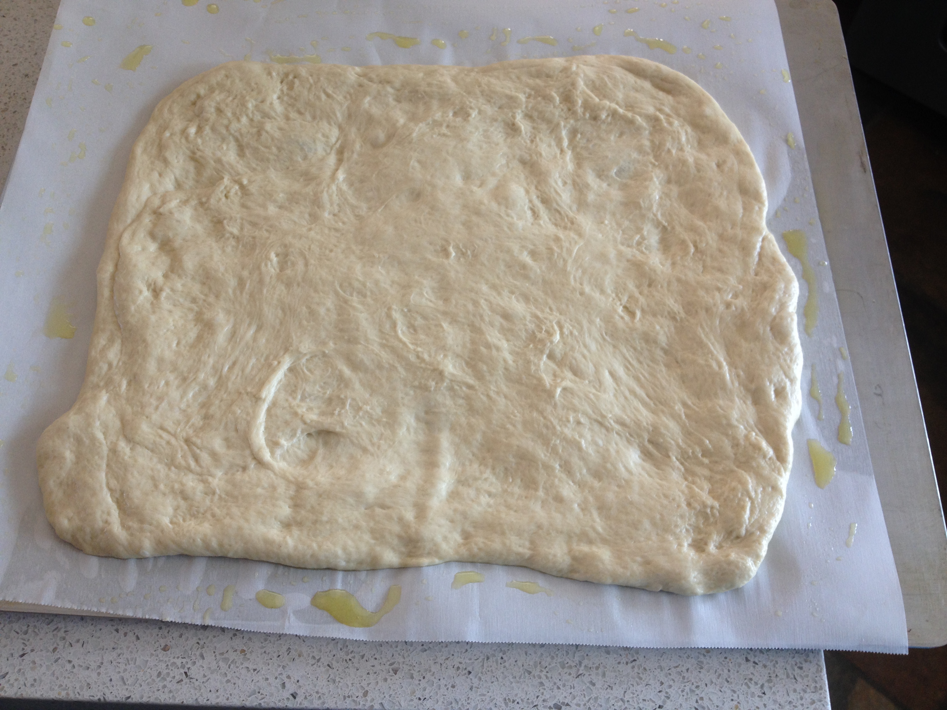 5. Place one sheet of parchment paper on a pizza peel or the back of a cookie sheet. Add a little olive oil to the parchment and place dough. Using hands, gently stretch dough into a rectangle, about 15 inches by 12 inches.