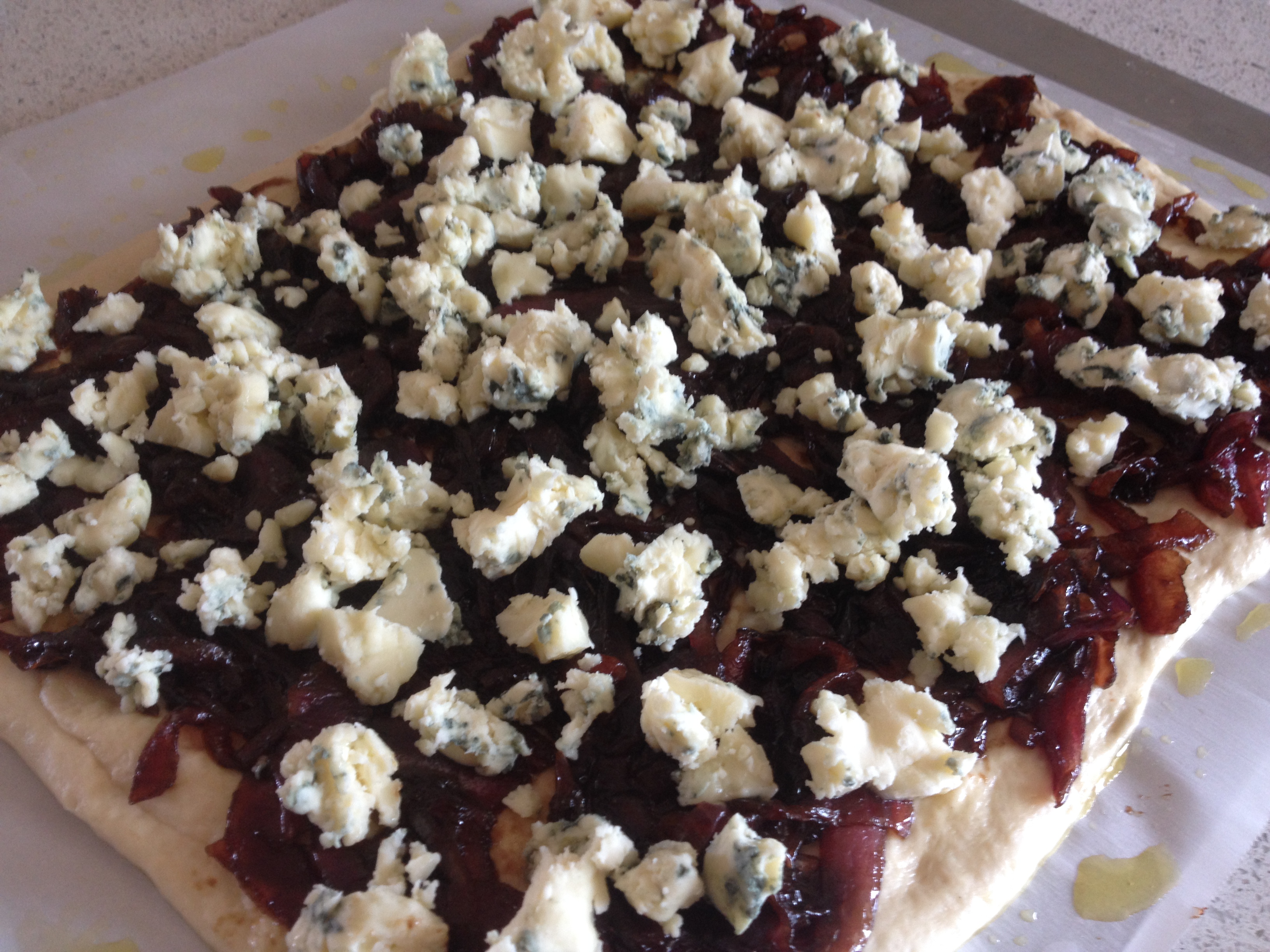 6. Spread caramelized onions evenly over dough. Crumble all but about 1 ounce of blue cheese and sprinkle evenly over onions.