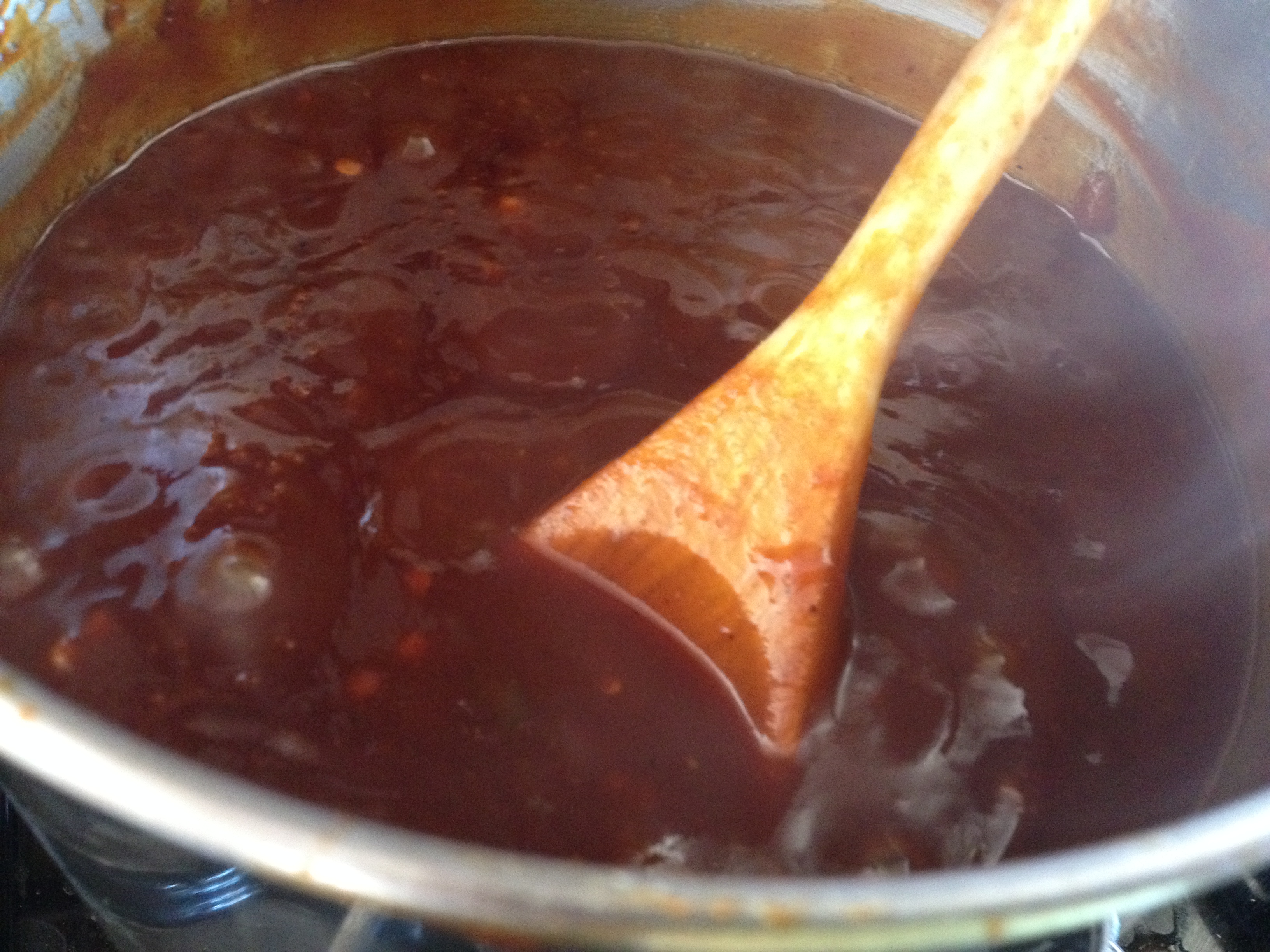 2. Add the brown sugar, ketchup, vinegar, Worcestershire and molasses. Bring the mixture to a boil, reduce to a simmer, and cook for 30 minutes to an hour (however thick you want to make it), stirring periodically.